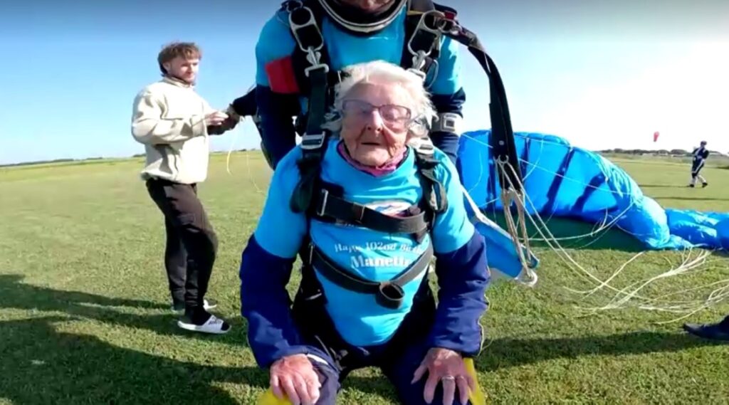 นางมาเนตต์ เบลลี ยายทวดวัย 102 ปี ปราศจากความกลัวเรื่องของการทำกิจกรรมท้าความตาย เพราะแต่งงานกับทหารพลร่ม และเคยรับใช้ชาติเป็นทหารสังกัดราชนาวีอังกฤษช่วงสงครามโลกครั้งที่ 2 โดยได้กลายเป็นนักดิ่งพสุธาที่อายุมากที่สุดของอังกฤษ หลังจากเสร็จสิ้นการโดดร่มพร้อมครูฝึกจากเครื่องบินเล็ก ที่ระดับความสูงเหนือพื้นดิน 7,000 ฟุต หรือ 2,133 เมตร ลงถึงพื้นดินในเทศมณฑลซัฟโฟล์คอย่างปลอดภัย เป็นการฉลองวันเกิดครบรอบ 102 ปี เพื่อระดมทุนเข้าองค์กรการกุศล