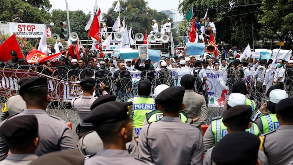ผู้ชุมนุมเคลื่อนขบวนไปตามท้องถนนในกรุงจาการ์ตาแล้วไปรวมตัวกันหน้าสถานทูตเมียนมา ตะโกนสรรเสริญพระเจ้า ถือป้ายเรียกร้องให้ยุติการเข่นฆ่าชาวโรฮิงญา และมองว่าเรื่องนี้ไม่ใช่เรื่องศาสนา แต่เป็นประเด็นด้านมนุษยธรรมที่เลวร้ายลง โฆษกตำรวจนครบาลเผยว่า กำลังทหารตำรวจพร้อมอาวุธ 6,000 นายอารักขาสถานทูตเมียนมา และมีรั้วลวดหนามล้อมรอบ โดยได้เพิ่มการเฝ้าระวังตั้งแต่มีคนขว้างระเบิดเพลิงใส่สถานทูตเมื่อวันอาทิตย์