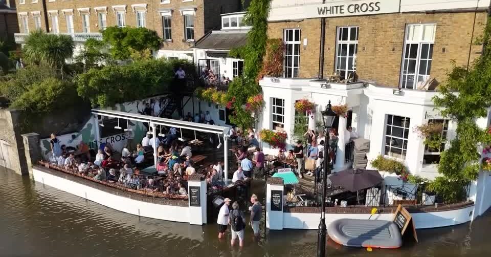 น้ำท่วมยังไงให้รู้สึกชิล ต้องไปกันที่ผับริมแม่น้ำเทมส์ในกรุงลอนดอนที่มีชื่อว่า “ไวท์ ครอสส์” (White Cross) ที่ประกาศตัวว่าเป็นผับที่ถูกน้ำท่วม แต่ทางร้านก็ไม่หยุดให้บริการ และขอเชิญชวนบรรดาลูกค้าทั้งหลายมาสัมผัสกับบรรยากาศชิล ๆ ในช่วงน้ำท่วมที่ผับได้ ซึ่งปรากฏว่ามีผู้คนแห่มาใช้บริการกันอย่างเนืองแน่น