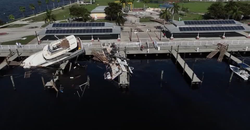คลิปภาพข่าวที่ถ่ายจากมุมสูงด้วยโดรนแสดงให้เห็นความเสียหายที่เกิดขึ้นกับอาคารบ้านเรือนและทรัพย์สินต่างๆ รวมทั้งเรือหลายลำขนาดต่างๆ กันที่ทั้งล่มจมน้ำและถูกคลื่นลมหอบขึ้นมาบนฝั่ง ถนนหนทางเต็มไปด้วยดินโคลน และบ้านและบริษัทธุรกิจกว่า 3 ล้านแห่ง ในรัฐฟลอริดา ไม่มีไฟฟ้าใช้ นอกจากนี้ยังมีทอร์นาโดเกิดขึ้นหลายลูกคร่าชีวิตผู้คนอย่างน้อย 12 คน