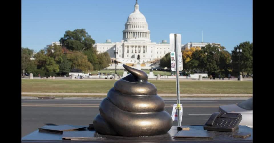 วอชิงตัน 26 ต.ค. – ประติมากรรมรูปก้อนอุจจาระขนาดใหญ่วางอยู่บนโต๊ะถูกนำมาวางไว้ที่หน้าอาคารรัฐสภา ในกรุงวอชิงตัน ดีซี ของสหรัฐ