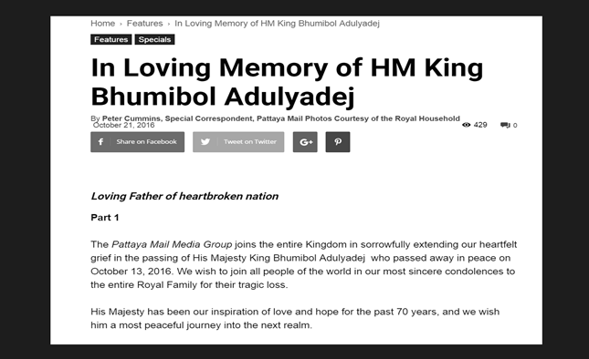 พัทยา 22 ต.ค.- เว็บไซต์พัทยาเมล์ลงบทความพิเศษเทิดพระเกียรติพระบาทสมเด็จพระปรมินทรมหาภูมิพลอดุลยเดช เขียนโดยนายปีเตอร์ คัมมินส์ ผู้สื่อข่าวพิเศษ และเผยแพร่ตอนแรกเมื่อวันที่ 21 ตุลาคม