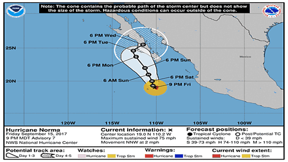 ศูนย์เฮอริเคนแห่งชาติสหรัฐแจ้งเมื่อเวลา 03.00 น.วันนี้ตามเวลามาตรฐานสากล ตรงกับเวลา 10.00 น.วันนี้ตามเวลาในไทยว่า นอร์มาอยู่ห่างจากเมืองกาโบซันลูกัส บริเวณปลายสุดของคาบสมุทรบาฮากาลิฟอร์เนียไปทางใต้ 435 กิโลเมตร เคลื่อนที่ขึ้นเหนือค่อนตะวันตกเฉียงเหนือด้วยความเร็ว 4 กิโลเมตรต่อชั่วโมง ขณะนี้เป็นเฮอริเคนระดับหนึ่ง มีความเร็วลมสูงสุดใกล้ศูนย์กลางที่ 121 กิโลเมตรต่อชั่วโมง คาดว่าจะทวีกำลังขึ้นอีกในช่วงวันสองวันข้างหน้า และน่าจะขึ้นฝั่งตอนปลายของคาบสมุทรบาฮากาลิฟอร์เนียภายในวันจันทร์ ใกล้แหล่งรีสอร์ทยอดนิยม จากนั้นจะอ่อนกำลังลง.-สำนักข่าวไทย