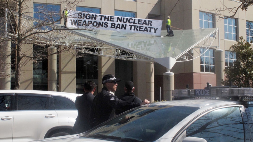 แคนเบอร์รา 20 ก.ย.- กลุ่มนักเคลื่อนไหวต่อต้านอาวุธนิวเคลียร์ 2 คนปีนทางเข้าอาคารกระทรวงต่างประเทศในออสเตรเลีย และคลี่แผ่นป้ายประท้วงรัฐบาลออสเตรเลียที่ไม่ยอมสนับสนุนสนธิสัญญาปลดอาวุธนิวเคลียร์ของสหประชาชาติ