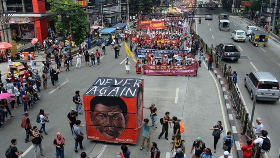 มะนิลา 21 ก.ย.- นักเคลื่อนไหว นักการเมือง และกลุ่มผู้ต่อต้านประธานาธิบดีโรดริโก ดูเตอร์เตของฟิลิปปินส์พากันชุมนุมวันนี้เนื่องในวันครบรอบ 45 ปีที่เฟอร์ดินานด์ มาร์กอส ประธานาธิบดีในขณะนั้นประกาศกฎอัยการศึก เพื่อปรามผู้นำคนปัจจุบันเรื่องการปกครองแบบเผด็จการ