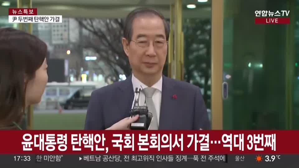 ทางด้านนายฮัน กล่าววันนี้ว่า เขาจะทำหน้าที่อย่างดีที่สุดเพื่อให้รัฐบาลมีเสถียรภาพหลังจากรัฐสภามีมติให้ถอดถอนนายยุน เขากล่าวว่า จะใช้ความแข็งแกร่งที่มีและความพยายามอย่างเต็มที่ในการบริหารรัฐบาลให้ทำงานได้อย่างมีเสถียรภาพในช่วงเวลาแห่งความยากลำบากในขณะนี้
