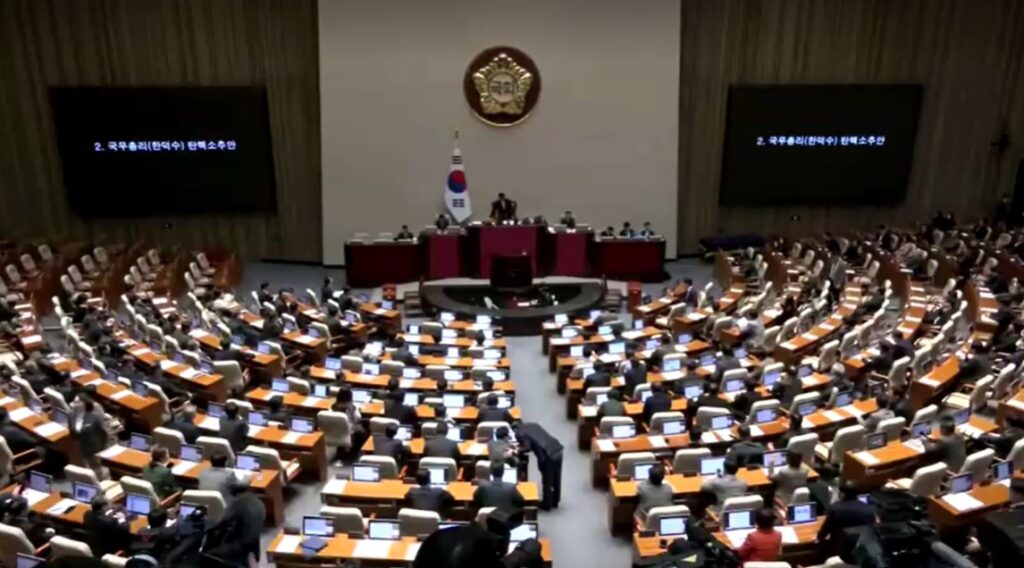 สมัชชาแห่งชาติเกาหลีใต้ได้ผ่านญัตติถอดถอนนายฮันด้วยคะแนน 192 เสียง เป็นเสียงข้างมากจากทั้งหมด 300 เสียง โดยเป็นเสียงของพรรคฝ่ายค้านทั้งหมด ขณะที่พรรครัฐบาลคว่ำบาตรการลงมติ นายอี แจ-มยอง หัวหน้าพรรคประชาธิปไตยที่เป็นพรรคฝ่ายค้านหลักกล่าวหานายฮันว่า เป็นกบฏ จากการไม่เร่งแต่งตั้งผู้พิพากษาศาลรัฐธรรมนูญ 3 คนในตำแหน่งที่ว่างอยู่ ในขณะที่ศาลรัฐธรรมนูญจะต้องพิจารณาเรื่องถอดถอนนายยุน ซอกยอล ออกจากตำแหน่งประธานาธิบดีหรือไม่จากการประกาศใช้กฎอัยการศึกเมื่อวันที่ 3 ธันวาคม นายฮันเพิ่งรับตำแหน่งรักษาการประธานาธิบดีเมื่อวันที่ 14 ธันวาคม วันเดียวกับที่สมัชชาแห่งชาติลงมติถอดถอนนายยุน.-814.-สำนักข่าวไทย