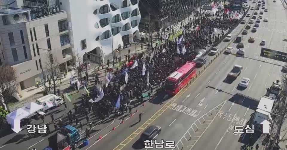 ตำรวจัดตั้งขบวนล้อมกรอบและสกัดกลุ่มผู้ประท้วงที่โบกธงในระหว่างที่พวกเขาเดินขบวนไปยังบ้านพักประจำตำแหน่งของนายยุน หลังจากที่เมื่อวานนี้ หน่วยอารักขาประธานาธิบดีและทหารขัดขวางมิให้เจ้าหน้าที่เข้าไปควบคุมตัวนายคิม ที่ถูกศาลออกหมายควบคุมตัว โดยทั้งสองฝ่ายเผชิญหน้ากันอย่างตึงเครียดภายในบริเวณบ้านพักในยุน เป็นเวลา 6 ชั่วโมง