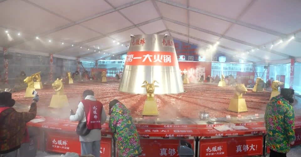 หม้อไฟยักษ์ตั้งอยู่ภายในโครงสร้างที่เป็นบ้านน้ำแข็ง อุณหภูมิ -20 องศาเซลเซียส จัดไว้บริการนักท่องเที่ยวและผู้เข้าร่วมชมงานเทศกาลน้ำแข็งและหิมะนานาชาติฮาร์บิน ครั้งที่ 41 ในเมืองฮาร์บิน มณฑลเฮย์หลงเจียง ทางตะวันออกเฉียงเหนือของจีน