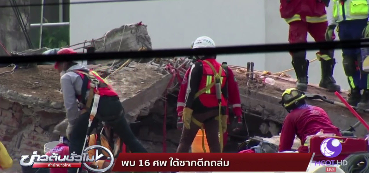 เม็กซิโก 27 ก.ย. – เจ้าหน้าที่กู้ภัยพบร่างผู้เสียชีวิตอยู่ใต้ซากอาคารสำนักงานหลังหนึ่งในกรุงเม็กซิโก ซิตี้ 16 คน ส่วนการสำรวจความเสียหายที่เกิดขึ้นกับอาคารสูง จนถึงขณะนี้พบว่ามีอาคารพังถล่มประมาณ 40 หลัง ขณะที่อีก 500 หลัง เสียหายอย่างหนัก ซึ่งอาจต้องเสริมความแข็งแรงของโครงสร้างครั้งใหญ่หรืออาจต้องทำลายทิ้ง ส่วนอีก 1,300 หลัง สามารถซ่อมแซมได้ และอีกประมาณ 10,000 หลัง ยังสามารถอยู่อาศัยต่อไปได้ ส่วนยอดผู้เสียชีวิตทั้งหมดล่าสุดอยู่ที่ 333 คน โดยอยู่ในกรุงเม็กซิโกซิตี้ 194 คน. – สำนักข่าวไทย