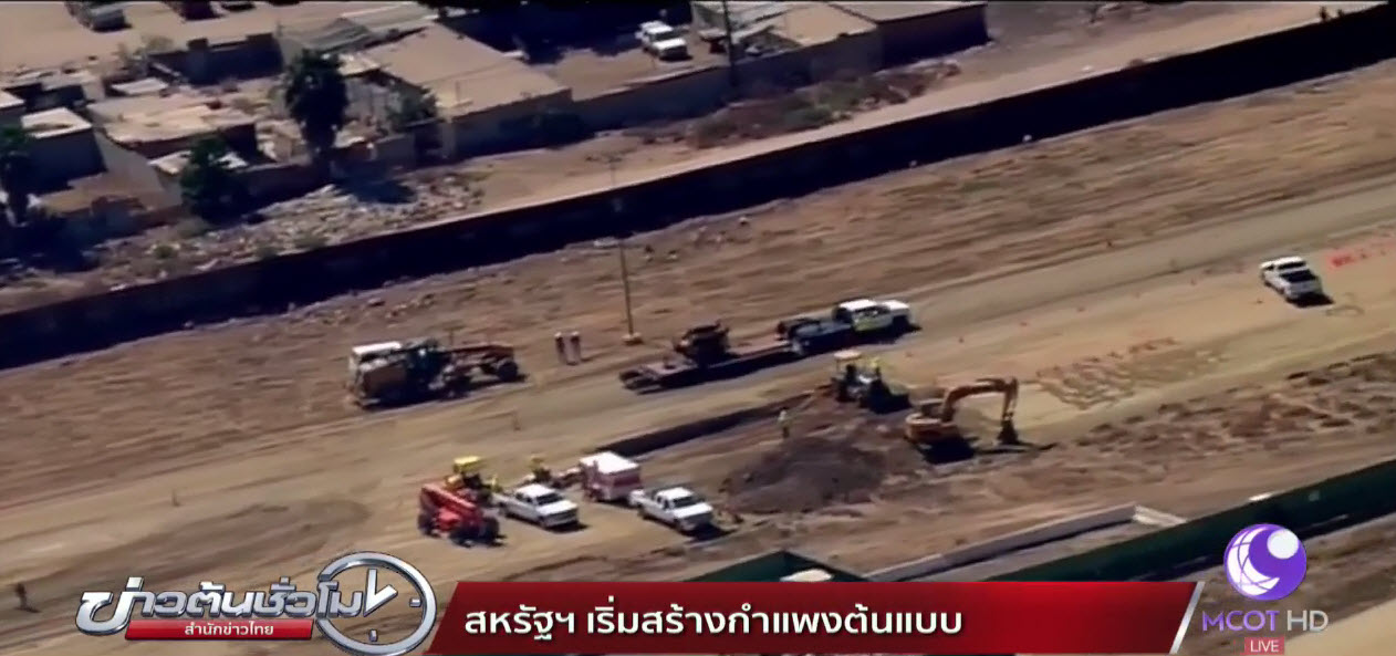 สหรัฐ 27 ก.ย. – แผนการก่อสร้างกำแพงกั้นพรมแดนเม็กซิโก ของประธานาธิบดีโดนัล์ ทรัมป์ เริ่มมีความคืบหน้าอย่างเป็นรูปธรรมแล้ว หลังบริษัทก่อสร้างเริ่มลงมือก่อสร้างกำแพงต้นแบบ 8 กำแพง โดย 4 กำแพงจะสร้างจากคอนกรีต ส่วนอีก 4 กำแพงสร้างจากวัสดุผสม กำแพงตัวอย่างมีความสูง 9 เมตร และยาว 9 เมตร ก่อสร้างขึ้นที่เมืองซานดิเอโก คาดว่าจะใช้เวลาก่อสร้าง 30 วัน ส่วนโครงการก่อสร้างกำแพงทั้งหมดคาดว่าจะต้องใช้เวลานานกว่า 3 ปี. – สำนักข่าวไทย