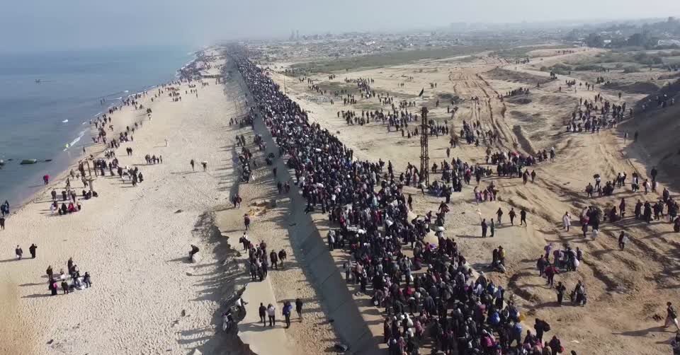 กาซา 28 ม.ค. – ผู้พลัดถิ่นและลี้ภัยสงครามชาวปาเลสไตน์จำนวนมากยังคงทยอยเดินเท้าไปตามถนนสายหลักริมชายฝั่งจากทางใต้ของฉนวนกาซา เพื่อกลับไปยังบ้านเรือนของตนเองทางภาคเหนือในวันนี้