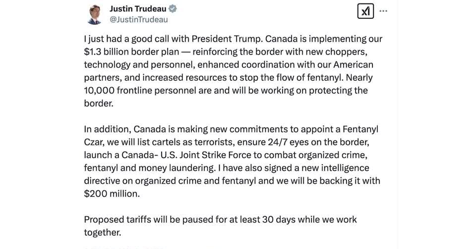 นายกรัฐมนตรีทรูโดโพสต์ผ่านแพลตฟอร์มเอ็กซ์ (X) หลังจากสนทนาทางโทรศัพท์กับประธานาธิบดีโดนัลด์ ทรัมป์ของสหรัฐเมื่อวันจันทร์ตามเวลาท้องถิ่นว่า ประธานาธิบดีทรัมป์จะชะลอการเก็บภาษีแคนาดาในอัตราร้อยละ 25 กับสินค้านำเข้าทั้งหมด และร้อยละ 10 กับสินค้าด้านพลังงาน