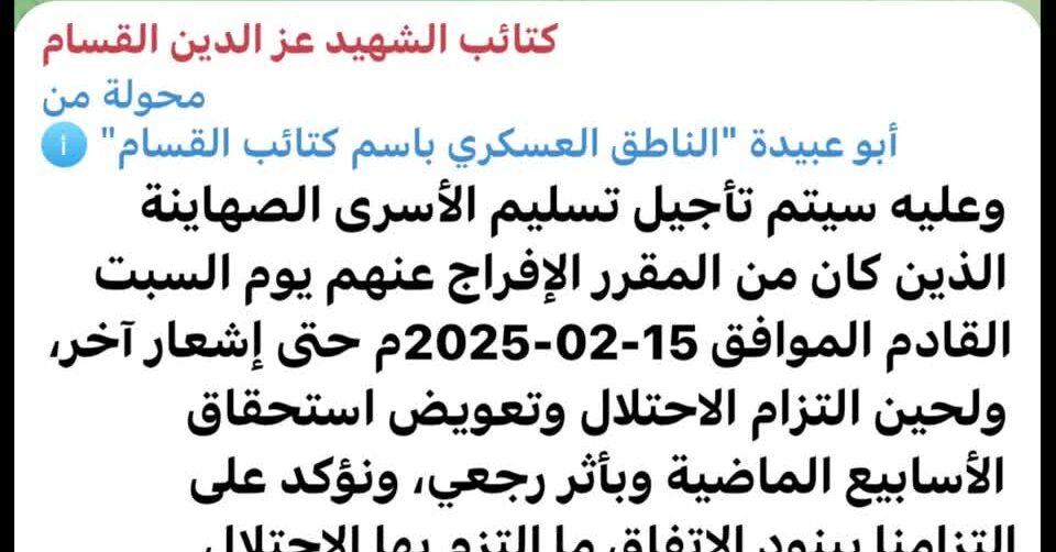 กลุ่มฮามาสออกแถลงการณ์ว่าจะปล่อยตัวประกันชาวอิสราเอลเพิ่มอีก 3 คนในวันเสาร์นี้ตามกำหนดเดิมซึ่งเป็นไปตามเงื่อนไขของข้อตกลงหยุดยิง แถลงการณ์ดังกล่าวมีขึ้นหลังจากที่ฮามาสได้เจรจากับคนกลางในอียิปต์และจอร์แดนซึ่งรับปากว่าจะดูแลและช่วยขจัดอุปสรรคในการจัดส่งความช่วยเหลือเข้าไปในฉนวนกาซ่า หลังจากเมื่อวันจันทร์ที่ผ่านมาฮามาสประกาศว่าจะเลื่อนการปล่อยตัวประกันออกไปโดยอ้างว่าอิสราเอลละเมิดข้อตกลงหยุดยิง