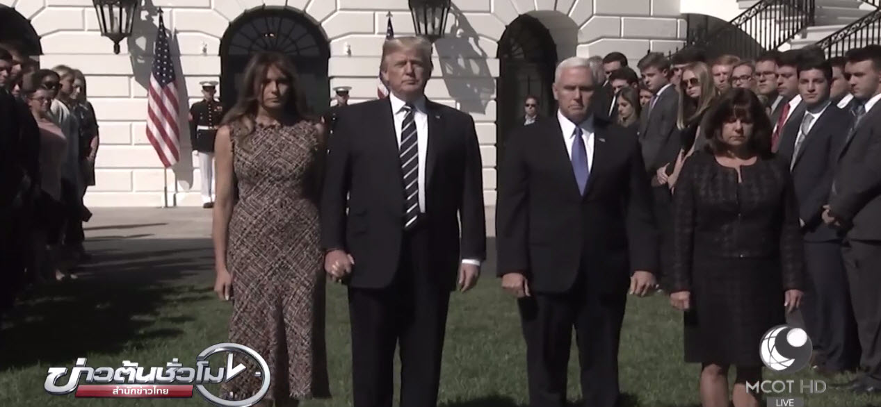 สหรัฐ 3 ต.ค.-ประธานาธิบดีโดนัลด์ ทรัมป์ และนางเมลาเนีย ทรัมป์ สตรีหมายเลข 1 รวมทั้งรองประธานาธิบดีสหรัฐ ยืนสงบนิ่งที่ด้านนอกทำเนียบขาว เพื่อไว้อาลัยให้กับผู้เสียชีวิตจากเหตุการณ์กราดยิงสังหารหมู่ 59 ศพ บาดเจ็บอีกกว่า 500 คน ที่เมืองลาสเวกัส โดยก่อนหน้านี้นายทรัมป์ระบุว่าจะเดินทางเยือนลาสเวกัสในวันพุธนี้.-สำนักข่าวไทย