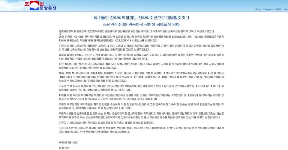 โซล 22 ก.พ. – กระทรวงกลาโหมเกาหลีเหนือ กล่าววันนี้ว่าเกาหลีเหนือมองเห็นการยั่วยุทางทหารของสหรัฐและพันธมิตรของสหรัฐเพิ่มมากขึ้นกว่าเดิม ในยุคที่ประธานาธิบดีโดนัลด์ ทรัมป์ กลับมาเป็นผู้นำสหรัฐอีกครั้ง