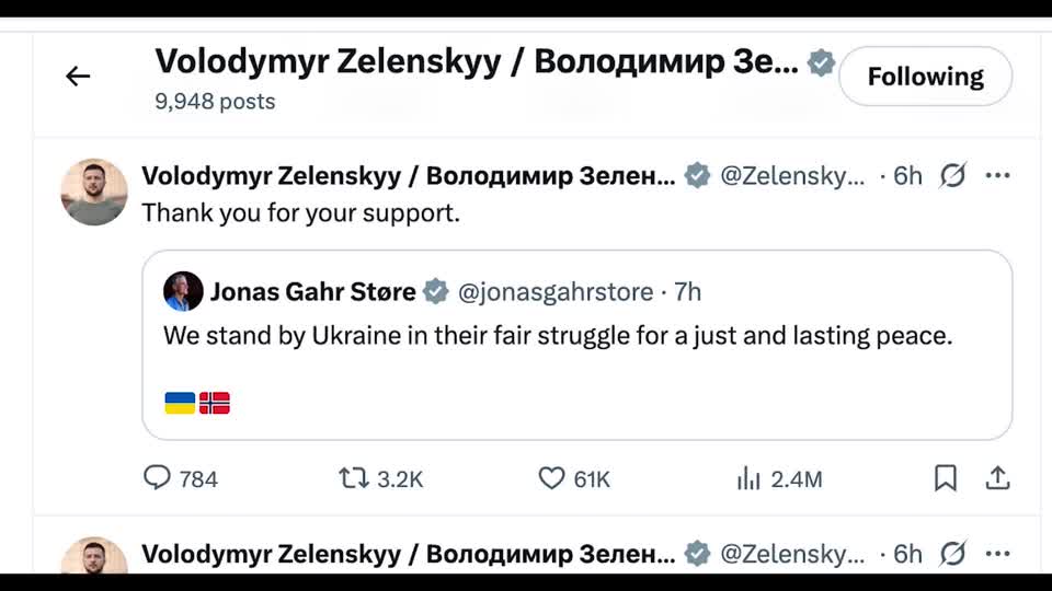 ทางด้านนายเซเลนสกี ได้เขียนคำว่า “ขอบคุณ” หลายสิบครั้ง ตอบข้อความในแอปพลิเคชันเอกซ์ของเขาที่มีคนโพสต์ข้อความสนับสนุนเขาหลังจากที่นายเซเลนสกี ถูกรองประธานาธิบดีเจดี แวนซ์ ของสหรัฐกล่าวหาว่า ไม่เคยกล่าวขอบคุณสหรัฐที่ให้ความช่วยเหลือ ในระหว่างการพบกันที่ทำเนียบขาว โดยการพบกันระหว่างนายเซเลนสกี กับนายทรัมป์และนายแวนซ์ จบลงอย่างล้มเหลว ทั้งสองฝ่ายปะทะคารมกันต่อหน้าสื่อทั่วโลกที่ติดตามทำข่าวนี้.-813.-สำนักข่าวไทย