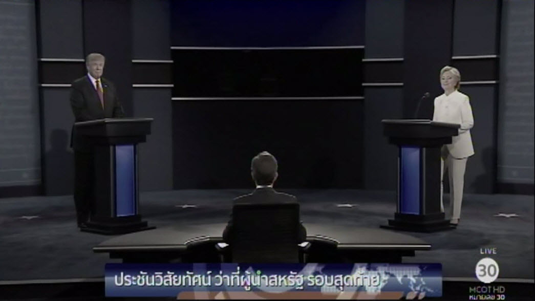 การประชันวิสัยทัศน์ว่าที่ผู้นำสหรัฐในรอบที่สาม ซึ่งเป็นรอบสุดท้าย ผ่านไปเกือบ 1 ชั่วโมงแล้ว ระหว่างนายโดนัลด์ ทรัมป์ ตัวแทนพรรครีพับลิกัน และนางฮิลลารี คลินตัน ตัวแทนพรรคเดโมแครต ถือเป็นครั้งสำคัญในภาวะที่นายทรัมป์ กำลังเพลี่ยงพล้ำ โดยผลโพลล่าสุดยังตามหลังนางคลินตัน บางโพลเป็นตัวเลข 2 หลัก บางโพล 6-7 จุด