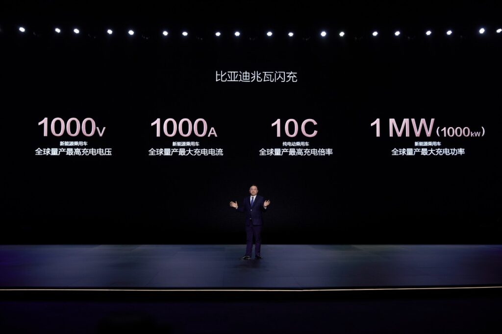 แพลตฟอร์ม Super-e ของ BYD สามารถเพิ่มกำลังการชาร์จได้ถึง 1 เมกะวัตต์ (1000 kW) ผ่านเทคโนโลยีการชาร์จแบบแฟลชเมกะวัตต์ ให้ความเร็วในการชาร์จที่เร็วที่สุดในโลก 2 กิโลเมตรต่อวินาที เพียง 5 นาที ก็สามารถเติมพลังงานให้รถวิ่งได้ไกลถึง 400 กิโลเมตร เทียบเท่ากับระยะเวลาเติมน้ำมันของรถยนต์สันดาปทำให้ “รถยนต์พลังงานใหม่กับรถน้ำมัน เร็วเท่ากันแล้ว!”