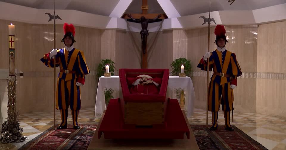 ในขณะเดียวกันในวันนี้สำนักวาติกันได้เผยแพร่ภาพพระศพของโป๊ปฟรังซิสซึ่งถูกอัญเชิญลงบรรทมในหีบพระศพเมื่อเวลา 20 นาฬิกาของคืนที่ผ่านมา โดยประดิษฐานเอาไว้ในโบสถ์ซานตา มาร์ตาซึ่งเป็นที่ประทับของพระองค์มาตลอดระยะเวลา 12 ปีที่ทรงดำรงตำแหน่งประมุขแห่งคริสตจักรคาทอลิกโดยมีครอบครัวของโป๊ปและเจ้าหน้าที่อาวุโสคนอื่นๆ ของวาติกันเข้าร่วมในพิธี