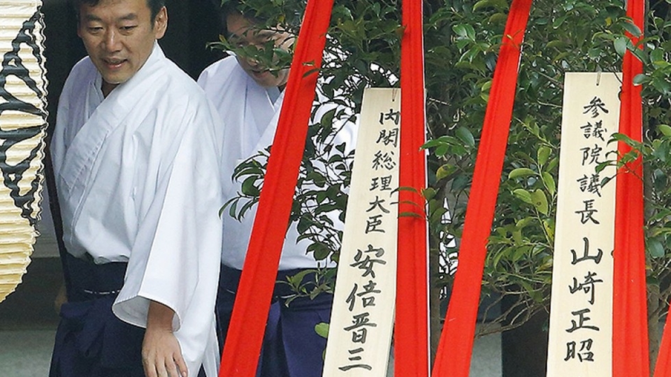 อาเบะและชาวญี่ปุ่นชาตินิยมยืนยันว่า ศาลเจ้ายาสุกุนิเป็นสถานที่ระลึกถึงทหารที่พลีชีพในสงคราม ไม่ต่างจากสุสานทหารอาร์ลิงตันในสหรัฐ แต่หลายประเทศที่ตกเป็นอาณานิคมญี่ปุ่นช่วงสงครามโลกครั้งที่ 2 มองว่าเป็นที่สักการะนายทหารและนักการเมืองญี่ปุ่นที่ต้องคดีอาชญากรรมสงคราม อาเบะไปศาลเจ้านี้ในเดือนธันวาคม 2556 ในวาระครบหนึ่งปีที่ดำรงตำแหน่ง ทำให้จีนและเกาหลีใต้ไม่พอใจ อีกทั้งยังถูกสหรัฐตำหนิด้วย หลังจากนั้นก็ไม่ได้ไปอีกเลย แต่ส่งเครื่องเซ่นไหว้ไปแทน.-สำนักข่าวไทย
