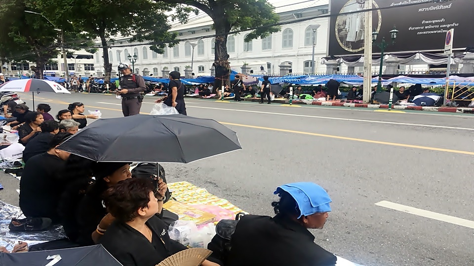 กรุงเทพฯ 24 ต.ค.- สำนักข่าวรอยเตอร์รายงานว่า ประชาชนจำนวนมากจากทั่วทุกสารทิศต่างฝ่าสายฝนที่ตกลงมาอย่างไม่ย่อท้อ หลายคนกางผ้าใบและเต็นท์รอ เพื่อกราบสักการะพระบรมศพพระบาทสมเด็จพระปรมินทรมหาภูมิพลอดุลยเดช บรมนาถบพิตร พระมหากษัตริย์ซึ่งเป็นที่เคารพรักของปวงชนชาวไทย ก่อนถึงวันพระราชพิธีถวายพระเพลิงพระบรมศพในหลวงรัชกาลที่ 9 วันที่ 26 ตุลาคมนี้