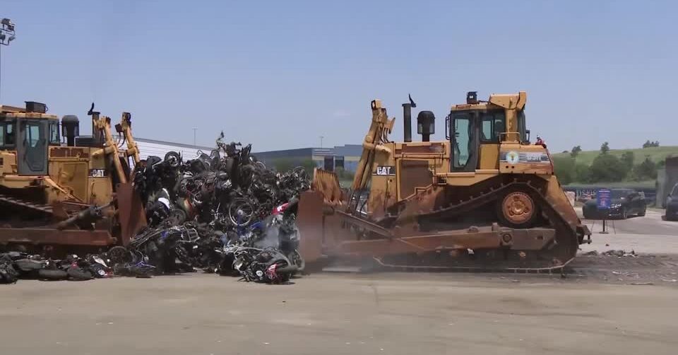 เมื่อวานนี้ มียานยนต์สองล้อผิดกฎหมายมากกว่า 200 คันถูกทำลายและกำจัดในเกาะสเตเทน ไอสแลนด์ของนครนิวยอร์ก เจ้าหน้าที่นำรถจักรยานยนต์มาจอดเรียงกัน ก่อนให้รถบดตรงเข้าบดขยี้ยานยนต์สองล้อผิดกฎหมายเหล่านี้เป็นเศษเหล็ก