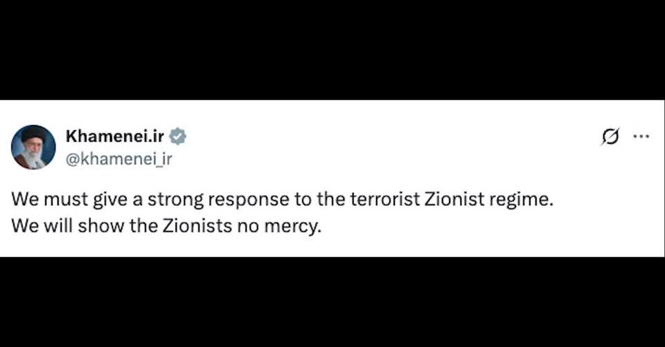 คาเมเนอีระบุผ่านแถลงการณ์ผ่านทางแพลตฟอร์มเอ็กซ์ว่า อิหร่านต้องตอบโต้อย่างรุนแรงต่อระบอบไซออนิสต์ผู้ก่อการร้าย เราจะไม่แสดงความเมตตาต่อพวกไซออนิสต์”
