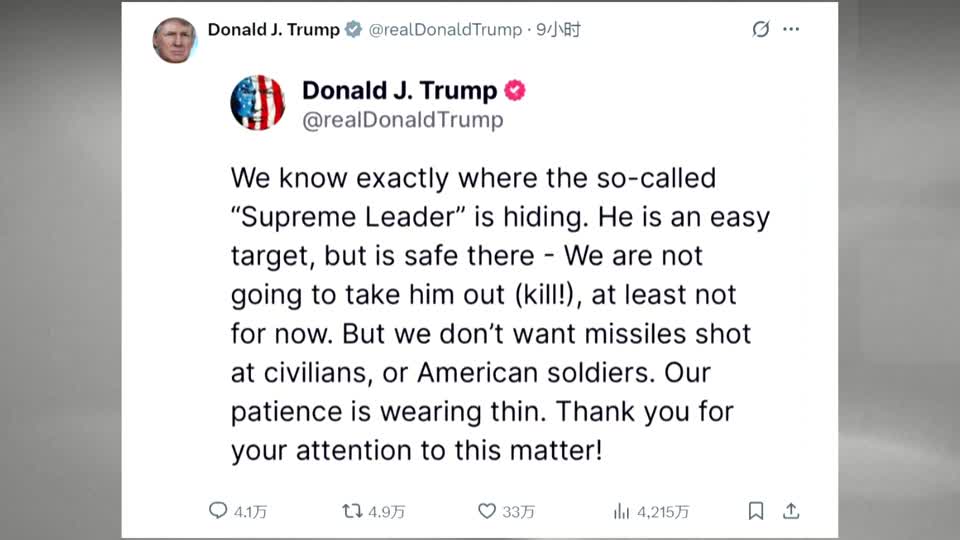 ทางด้านนายทรัมป์ได้เตือนผ่านทางสื่อสังคมออนไลน์ของเขาว่า ความอดทนของสหรัฐกำลังจะหมดลง ในขณะเดียวกัน เขาระบุว่า ยังไม่มีความตั้งใจในการกำจัดผู้นำสูงสุดของอิหร่านในตอนนี้ แต่ท่าทีของเขาก็บ่งชี้ถึงความพร้อมที่จะเข้ามามีบทบาทในความขัดแย้งนี้มากขึ้น