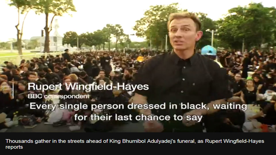 กรุงเทพฯ 26 ต.ค.- ผู้สื่อข่าวบรรษัทกระจายเสียงอังกฤษ (บีบีซี) รายงานบรรยากาศปวงชนชาวไทยสวมชุดดำเฝ้ารอเต็มสองข้างทางในวันพระราชพิธีถวายพระเพลิงพระบรมศพพระบาทสมเด็จพระปรมินทรมหาภูมิพลอดุลยเดชในวันนี้