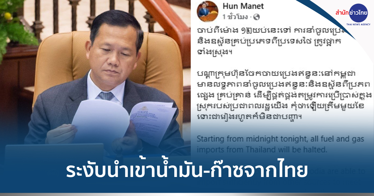 กัมพูชา 22 มิ.ย. – “ฮุน มาเนต” นายกรัฐมนตรีกัมพูชา ประกาศระงับนําเข้าน้ำมันเชื้อเพลิง-ก๊าซทุกชนิดจากไทย เริ่มเที่ยงคืนนี้ มั่นใจบริษัทในกัมพูชาหาเชื้อเพลิงจากแหล่งอื่นให้ประชาชนได้เพียงพอ
