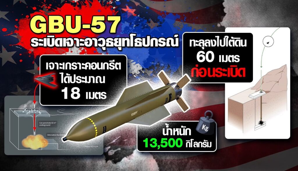 ครั้งแรกที่ระเบิดทลายบังเกอร์อานุภาพสูง น้ำหนักถึง 13 ตัน GBU-57 สำแดงอานุภาพความเป็นระเบิดเจาะอาวุธยุทโธปกรณ์ขนาดใหญ่ ทะลุทะลวงพื้นดินลงไป 16 เมตร ก่อนจะระเบิดเจาะเกราะคอนกรีตได้ประมาณ 18 เมตร แหล่งข่าวเผยว่าแต่ละจุดใช้ GBU-57 ซ้ำสองลูก