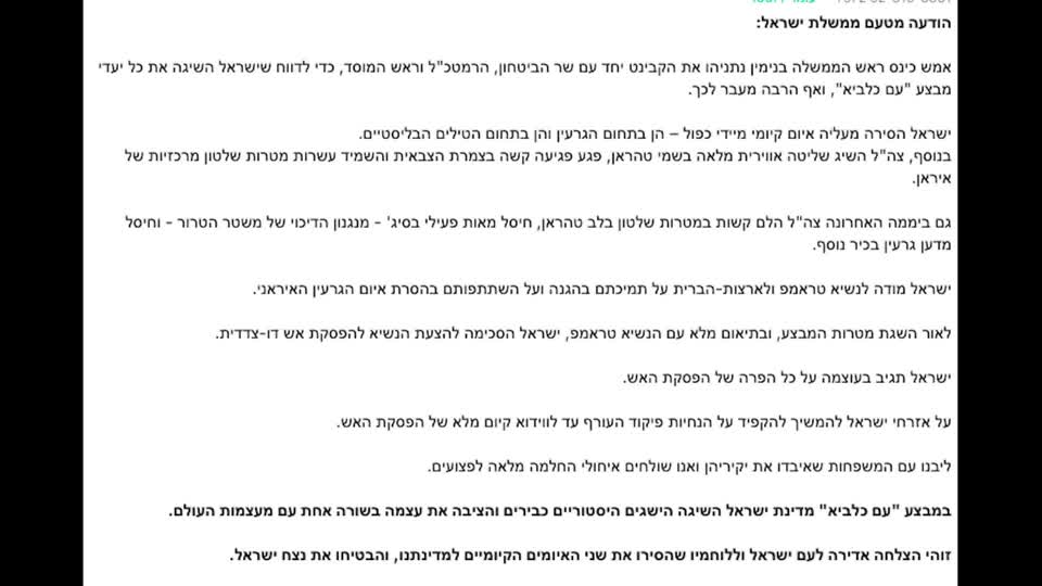 แถลงการณ์ของนายกรัฐมนตรีอิสราเอลระบุว่า อิสราเอลขอขอบคุณประธานาธิบดีทรัมป์และสหรัฐที่ให้การสนับสนุนด้านการป้องกันประเทศ และการมีส่วนร่วมในการกำจัดภัยคุกคามนิวเคลียร์ของอิหร่าน แถลงการณ์ยังระบุเพิ่มเติมว่า เพื่อให้สอดคล้องกับการบรรลุเป้าหมายของการปฏิบัติการ และด้วยการประสานงานอย่างเต็มที่กับประธานาธิบดีทรัมป์ อิสราเอลจึงตกลงตามข้อเสนอของประธานาธิบดีสำหรับการหยุดยิงร่วมกัน