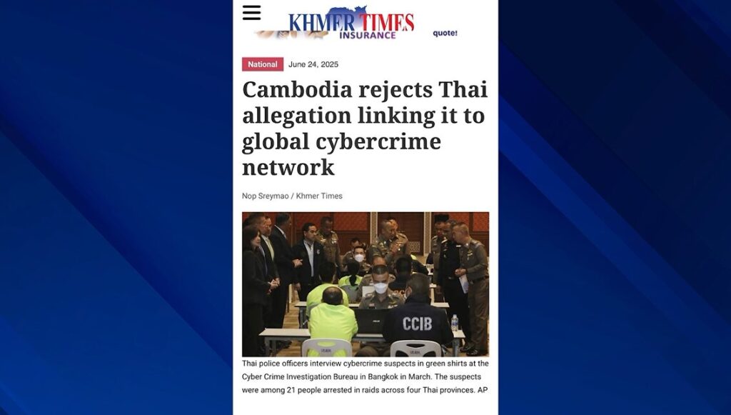 ในขณะที่ เว็บไซต์แขมร์ ไทมส์ รายงานว่า ฝ่ายกัมพูชาได้ออกแถลงการณ์ตอบโต้ หลังจากที่นางสาวแพทองธาร ชินวัตร นายกรัฐมนตรีของไทยออกมาแถลงว่า กัมพูชาเป็น ‘ศูนย์กลางอาชญากรรมระดบโลก’ ท้าว่า หากรัฐบาลไทยมีข้อมูลจริง ก็ควรเปิดเผยออกมาให้ประชาคมโลกเห็น ตั้งแต่ปี 2565 กัมพูชาปราบปรามแก๊งคอลเซ็นเตอร์อย่างจริงจัง และอ้างว่ากลุ่มอาชญากรจำนวนมากที่ปฏิบัติการในกัมพูชา มีคนไทยเป็นผู้กระทำผิดบางส่วนที่ถูกจับกุมในกัมพูชา มีการค้ามนุษย์ลักลอบพาคนไทยเข้าไปในแหล่งกบดานแก๊งคอลเซ็นเตอร์.-สำนักข่าวไทย