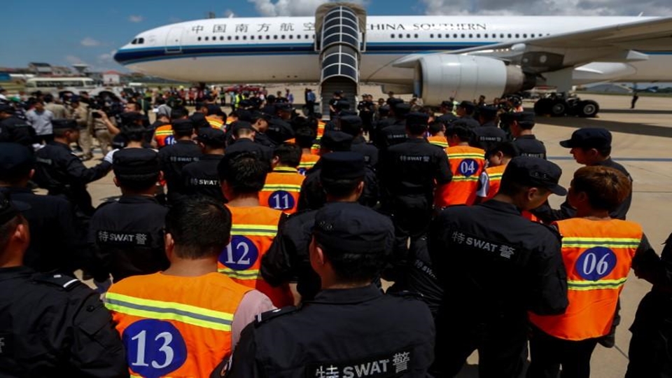ตำรวจกัมพูชาส่งภาพถ่ายให้สำนักข่าวรอยเตอร์ในวันนี้ เป็นภาพผู้ต้องสงสัยสวมเสื้อสีแดงถูกมัดข้อมือรวมกันก่อนถูกเนรเทศ หัวหน้าหน่วยสอบสวน สำนักงานตรวจคนเข้าเมืองเผยว่า ตำรวจจีนเดินทางมารับผู้ต้องสงสัยทั้ง 61 คนที่ถูกจับกุมในช่วงที่ทางการกัมพูชาปฏิบัติการตรวจค้นในกรุงพนมเปญ จังหวัดกันดาล และจังหวัดสีหนุวิลล์ระหว่างวันที่ 17-21 ตุลาคมที่ผ่านมา ในจำนวนนี้เป็นสตรี 13 คน