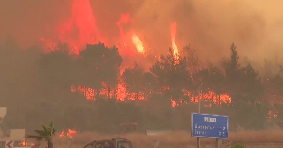 ด้านเจ้าหน้าที่ดับเพลิงตุรกียังคงต่อสู้กับเปลวเพลิงอย่างต่อเนื่อง โดยมีเฮลิคอปเตอร์และเครื่องบินทิ้งน้ำเหนือพื้นที่ภูเขาในอิซเมียร์ ขณะที่ทางการปิดถนนบางสายที่มุ่งหน้าไปยังเมืองตากอากาศเซสเม ซึ่งตั้งอยู่ริมทะเลอีเจียน ภาพจากสถานีโทรทัศน์เผยให้เห็นเปลวเพลิงที่ล้อมรอบทางหลวงสายหลักขณะที่รถบรรทุกน้ำเดินทางมาถึง