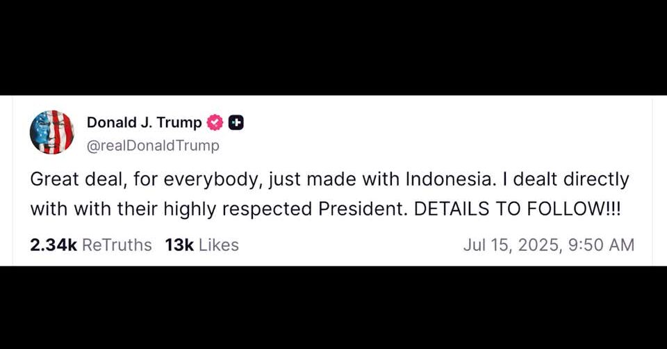 ประธานาธิบดีโดนัลด์ ทรัมป์ ของสหรัฐ ประกาศข้อตกลงการค้ากับอินโดนีเซียในวันอังคาร เป็นข้อตกลงล่าสุดที่มุ่งกระชับความสัมพันธ์ที่ดีขึ้นกับประเทศคู่ค้า และลดยอดขาดดุลการค้าจำนวนมหาศาลของสหรัฐ โดยทรัมป์ระบุว่า สหรัฐจะไม่จ่ายภาษีนำเข้า-ส่งออกไปยังอินโดนีเซีย เราจะเข้าถึงอินโดนีเซียอย่างเต็มที่ ซึ่งเป็นส่วนหนึ่งของข้อตกลงการค้าครั้งนี้ ขณะที่อินโดนีเซียจะจ่ายภาษีสินค้าส่งออกไปยังสหรัฐที่ร้อยละ 19