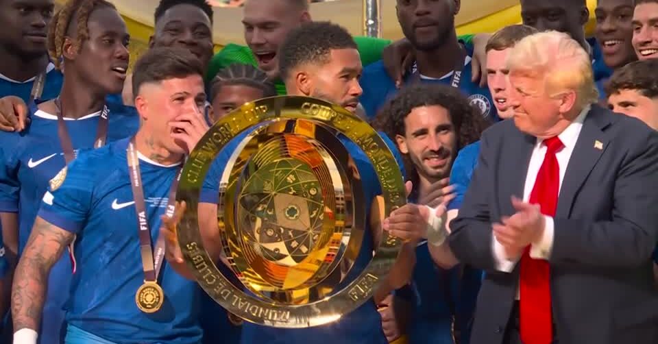 ประธานาธิบดีทรัมป์ และ จานนี่ อินฟานติโน ประธานสหพันธ์ฟุตบอลนานาชาติ หรือฟีฟ่า ได้เข้าชมรอบชิงชนะเลิศการแข่งขันฟุตบอลสโมสรโลก เมื่อวันอาทิตย์ ก่อนทั้งคู่จะร่วมมอบถ้วยแชมป์ให้กับ รีซ เจมส์ กัปตันทีมเชลซี ซึ่งเขาและเพื่อนร่วมทีมคนอื่นมีสีหน้าที่งุนงงตอนที่ทรัมป์เข้ามายืนอยู่หน้าสุดตรงกลางขณะรับถ้วย ไม่ได้หลบลงเวทีไป