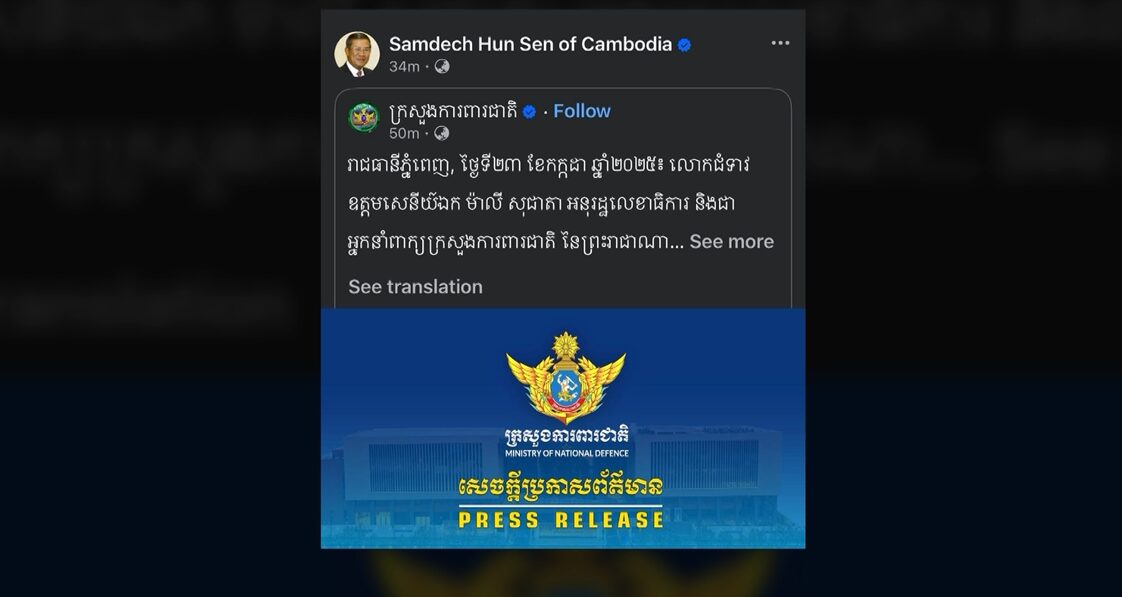 “ฮุน เซน” ประธานวุฒิสภาของกัมพูชา แชร์โพสต์จาก เพจทางการของกระทรวงกลาโหมกัมพูชา ที่โพสต์ข้อความ ระบุพลเอกหญิง มะลิ โสเจียตา รองเลขาธิการ และโฆษกกระทรวงกลาโหมแห่งราชอาณาจักรกัมพูชา แถลงการณ์ปฏิเสธข้อกล่าวหาอย่างสิ้นเชิงจากฝ่ายไทย ซึ่งไร้ซึ่งมูลความจริง กรณีเหตุการณ์ทหารไทย ได้รับบาดเจ็บจากเหตุระเบิดกับระเบิดในหมู่บ้านอันเซ ตำบลเจียมก์ซาน อำเภอเจียมก์ซาน จังหวัดพระวิหาร ประเทศกัมพูชา เมื่อวันที่ 23 กรกฎาคม 2025