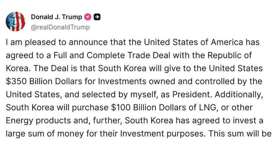 นายทรัมป์โพสต์ข้อความผ่านทางแอปพลิเคชัน “ทรูธ โซเชียล” ว่าเขายินดีที่จะประกาศว่าสหรัฐได้ตกลงข้อตกลงทางการค้าที่สมบูรณ์และครบถ้วนกับสาธารณรัฐเกาหลีแล้ว ประธานาธิบดีสหรัฐกล่าวว่า เกาหลีใต้ตกลงที่จะลงทุน 350,000 ล้านดอลลาร์ ในสหรัฐ ในโครงการที่นายทรัมป์เลือก และจะซื้อผลิตภัณฑ์พลังงานมูลค่า 100,000 ล้านดอลลาร์