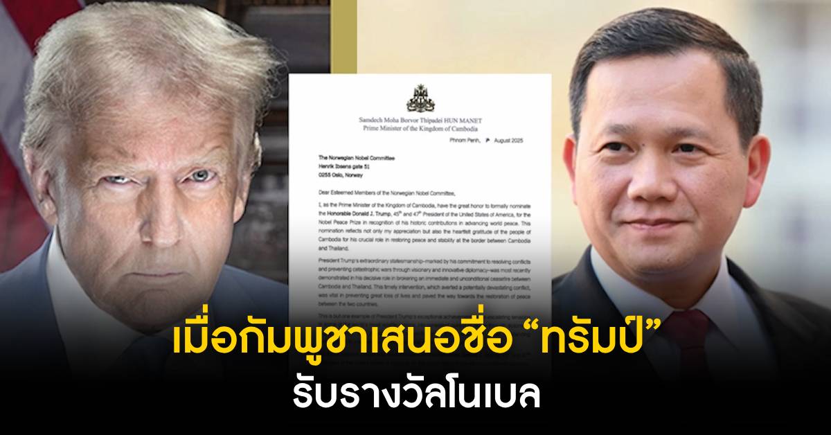 จดหมายฉบับนี้ของนายฮุน มาเนต นายกรัฐมนตรีกัมพูชา เป็นการแสดงเจตจำนงอย่างเป็นทางการต่อคณะกรรมการโนเบลของนอร์เวย์ เสนอชื่อนายโดนัลด์ ทรัมป์ เข้าชิงรางวัลโนเบลสาขาสันติภาพ ผู้นำกัมพูชาแสดงความซาบซึ้งต่อบทบาทนายทรัมป์ ในการฟื้นฟูสันติภาพและเสถียรภาพบริเวณชายแดนระหว่างกัมพูชาและไทย