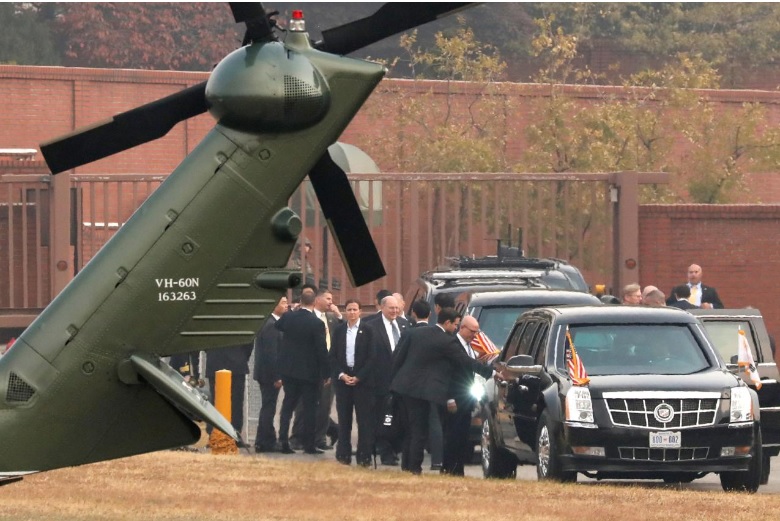 ทำเนียบขาวของสหรัฐประกาศก่อนหน้านี้ว่า ประธานาธิบดีทรัมป์ไม่มีกำหนดการจะเดินทางไปยังเขตปลอดทหาร แต่เมื่อช่วงเช้าที่ผ่านมา ผู้สื่อข่าวที่ติดตามประธานาธิบดีได้รับแจ้งแผนกำหนดการกระทันหันว่า นายทรัมป์จะเดินทางไปยังเขตปลอดทหาร ประธานาธิบดีทรัมป์ได้ออกจากโรงแรมในกรุงโซลเมื่อตอนเช้าตรู่และเดินทางไปยังฐานทัพยองซาน แต่เฮลิคอปเตอร์ที่จะใช้เดินทางไปยังเขตปลอดทหารไม่สามารถเดินทางไปได้ เนื่องจากสภาพอากาศไม่ดี โฆษกหญิงของสหรัฐกล่าวว่า ประธานาธิบดีมุน แจ-อิน ของเกาหลีใต้ มีกำหนดจะร่วมเดินทางไปกับคณะของนายทรัมป์ด้วย เฮลิคอปเตอร์มารีนวัน ของผู้นำสหรัฐ ซึ่งขึ้นจากฐานทัพยองซานแล้ว แต่จำเป็นต้องกลับมาลงจอด เนื่องจากหมอกลงจัด คณะผู้นำสหรัฐได้รอคอยเกือบ 1 ชั่วโมง เพื่อให้สภาพอากาศดีขึ้น แต่อากาศกลับแย่งลงอีก ทำให้สุดท้ายแล้วต้องยกเลิกการเดินทางในที่สุด ตามปกติแล้ว ประธานาธิบดีสหรัฐที่ไปเยือนเกาหลีใต้มักจะเดินทางไปยังเขตปลอดทหารด้วย แต่ครั้งนี้ไม่อยู่ในกำหนดการของประธานาธิบดีทรัมป์.-สำนักข่าวไทย