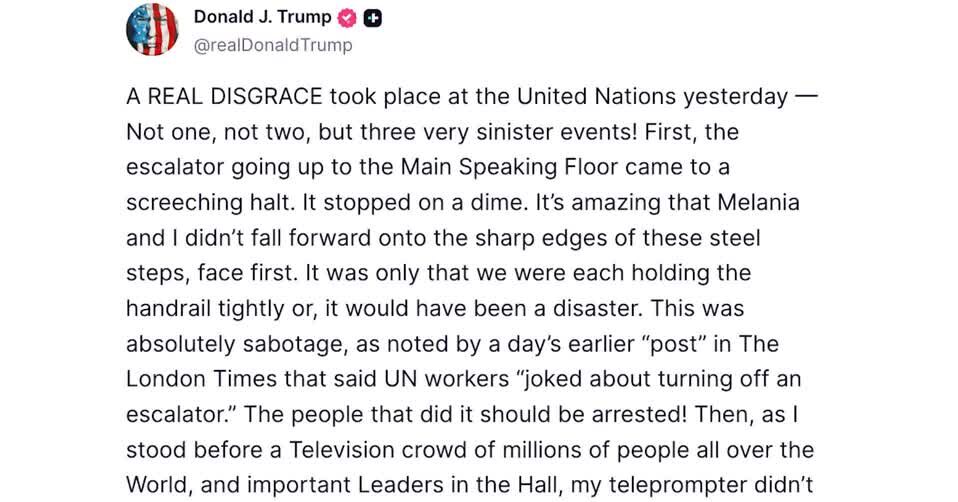 นายทรัมป์ระบุในข้อความที่เขาโพสต์บนแพลตฟอร์ม “ทรูธ โซเชียล” (Truth Social) ว่า บันไดเลื่อนที่เขากำลังใช้งานพร้อมกับนางเมลาเนีย ผู้เป็นภรรยา ได้หยุดกระทันหัน ขณะกำลังขึ้นไปยังชั้นหลักของอาคารสหประชาชาติ จนเกือบทำให้ทั้งคู่ล้มลง และเขาเรียกร้องให้มีการจับกุมผู้ที่รับผิดชอบ