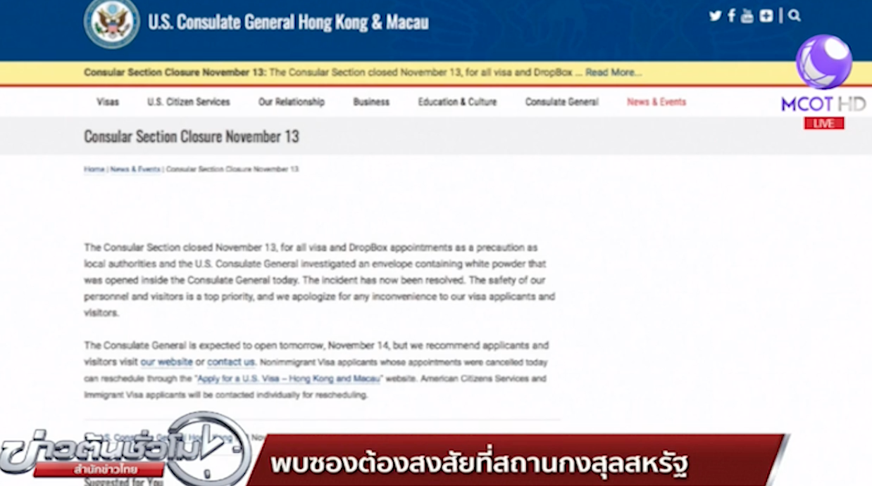 ฮ่องกง 13 พ.ย.- ตำรวจฮ่องกงเร่งเข้าตรวจสอบที่สถานกงสุลสหรัฐในฮ่องกง หลังพบซองจดหมายต้องสงสัยบรรจุผงสีขาวอยู่ภายใน ขณะที่สถานกงสุลได้ยกเลิกการนัดหมายทำวีซ่าในวันนี้ และให้ผู้ที่เข้าคิวรออยู่เดินทางกลับบ้านทันที อย่างไรก็ตาม เจ้าหน้าที่แถลงในเวลาต่อมาว่า ผงสีขาวดังกล่าวไม่เป็นอันตรายแต่อย่างใด และยืนยันว่าการดำเนินการต่างๆคำนึงถึงความปลอดภัยของเจ้าหน้าที่และประชาชนผู้มาใช้บริการเป็นสำคัญ.-สำนักข่าวไทย