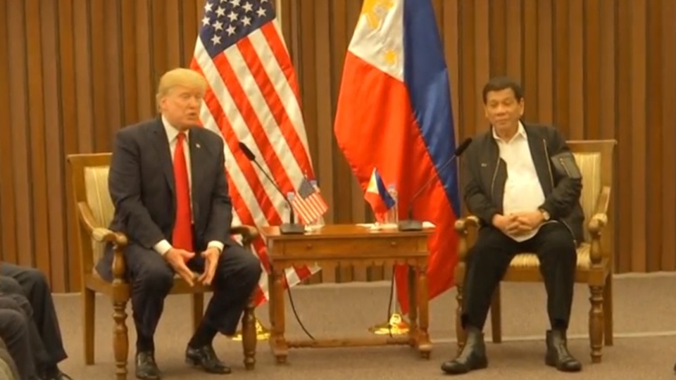 ประธานาธิบดีทรัมป์ไปร่วมการประชุมสุดยอดสมาคมประชาชาติเอเชียตะวันออกเฉียงใต้ (อาเซียน) และการประชุมที่เกี่ยวข้องกับผู้นำ 18 ชาติที่กรุงมะนิลาของฟิลิปปินส์วันที่ 13-14 พฤศจิกายน เป็นที่หมายสุดท้ายของการตระเวนเยือนเอเชียนาน 12 วัน กลุ่มสิทธิเรียกร้องให้เขาประณามการทำสงครามปราบปรามยาเสพติดของดูเตอร์เต แต่ผู้นำทั้งสองคุยกันอย่างสนิทสนมตั้งแต่พบกันเมื่อคืนวันอาทิตย์จนถึงเช้าวันจันทร์ ล่าสุดทรัมป์ประกาศก่อนเริ่มการหารืออย่างเป็นทางการช่วงมื้อเที่ยงวันนี้ว่า เขาและดูเตอร์เตมีความสัมพันธ์ที่ดีเยี่ยม พร้อมกับชมดูเตอร์เตว่าจัดการประชุมสุดยอดได้ดี น่าพึงพอใจ แต่เมื่อผู้สื่อข่าวถามว่า ทรัมป์จะหยิบยกเรื่องสิทธิมนุษยชนขึ้นหารือหรือไม่ ผู้นำทั้งสองไม่ตอบแต่อย่างใด โฆษกประธานาธิบดีฟิลิปปินส์แถลงในเวลาต่อมาว่า การสนทนาดำเนินไปนานกว่า 40 นาที และผู้นำสหรัฐไม่ได้พูดถึงเรื่องสิทธิมนุษยชน