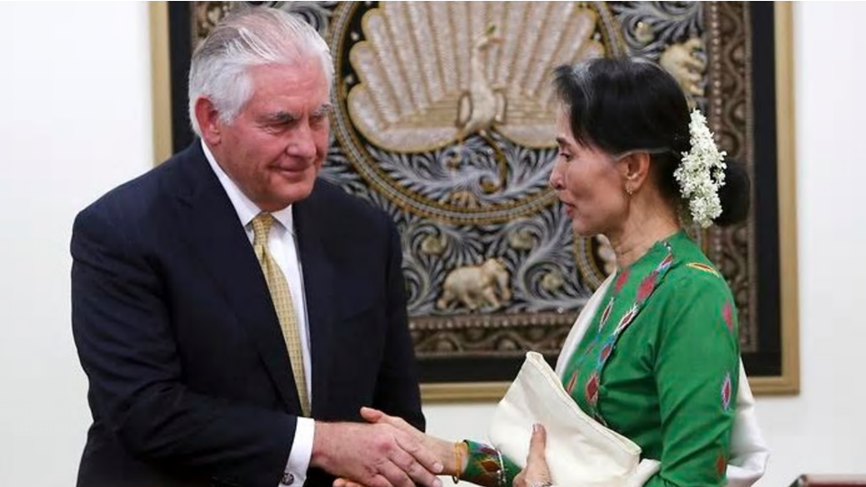 ด้านนายทิลเลอร์สันกล่าวว่า สหรัฐอยากให้เมียนมาประสบความสำเร็จ ลำพังออกมาตรการคว่ำบาตรทางเศรษฐกิจแล้วบอกว่าวิกฤตจบลงแล้วจึงไม่สามารถทำได้ อย่างไรก็ดี สหรัฐกังวลอย่างยิ่งต่อรายงานข่าวที่เชื่อถือได้ว่ากองกำลังความมั่นคงเมียนมากระทำการโหดร้ายทารุณอย่างกว้างขวาง ขอให้เมียนมาเปิดการสอบสวนที่เชื่อถือได้ต่อข้อกล่าวหาเหล่านี้ เพราะภาพที่เกิดขึ้นในรัฐยะไข่เป็นเรื่องน่ากลัว นอกจากหารือกับนางซู จีแล้ว รัฐมนตรีต่างประเทศสหรัฐยังได้แยกพบกับ พล.อ.อาวุโส มิน อ่องหล่าย ผู้บัญชาการทหารสูงสุดของเมียนมาด้วย