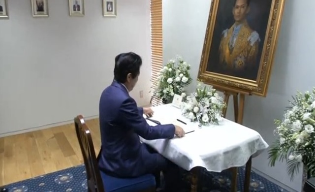 นายกรัฐมนตรีอาเบะกล่าวกับผู้สื่อข่าวหลังจากลงนามในหนังสือแสดงความเสียใจในเช้าวันนี้ว่า ขอแสดงความเสียใจอย่างสุดซึ้งกับประชาชนและรัฐบาลไทย ขอส่งใจและสวดภาวนาร่วมกับชาวไทยท่ามกลางความโศกเศร้าสุดพรรณา