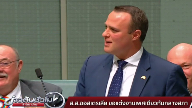 ออสเตรเลีย 4 ธ.ค. – นายทิม วิลสัน สมาชิกสภาผู้แทนราษฎรออสเตรเลีย ได้ขอนายไรอัน โบลเกอร์ คู่รักเพศเดียวกัน แต่งงานกลางสภา แต่รอให้สภาผ่านกฎหมายรับรองการแต่งงานก่อน จึงจะจัดงานแต่งงานกันได้ โดยร่างกฎหมายฉบับนี้จะเข้าสู่การพิจารณาของสภาในสัปดาห์นี้ หลังผ่านความเห็นชอบจากวุฒิสภาเมื่อเดือนที่แล้ว ซึ่งหากเป็นไปตามคาด ออสเตรเลียจะเป็นประเทศที่ 26 ที่อนุญาตให้การแต่งงานของคู่รักเพศเดียวกันเป็นสิ่งที่ถูกต้องตามกฎหมาย. – สำนักข่าวไทย