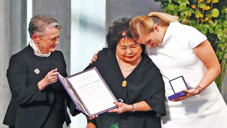 นอกจากผู้อำนวยการไอแคนแล้ว ยังมีนางเซ็ตสึโกะ เธอร์โลว์ สตรีแคนาดาเชื้อสายญี่ปุ่นวัย 85 ปีขึ้นเวทีด้วย เธอรอดชีวิตจากเมื่อครั้งสหรัฐทิ้งระเบิดนิวเคลียร์ถล่มเมืองฮิโรชิมาในช่วงสงครามโลกครั้งที่ 2 เมื่อวันที่ 6 สิงหาคม 2488 และปัจจุบันเข้าร่วมรณรงค์ต่อต้านนิวเคลียร์กับไอแคนที่เป็นการรวมตัวกันขององค์กรนอกภาครัฐ (เอ็นจีโอ) 468 แห่งทั่วโลก.-สำนักข่าวไทย