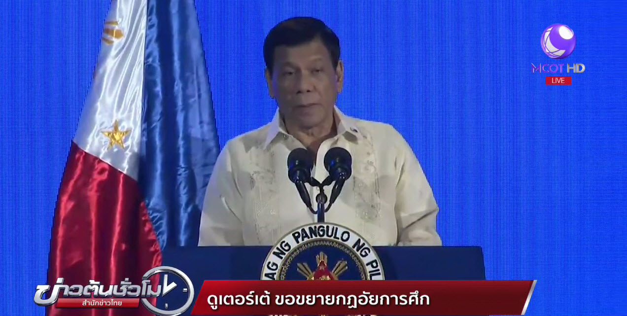 เดิมการประกาศกฎอัยการศึกจะมีเวลาจำกัดเพียง 60 วัน ตามที่รัฐธรรมนูญกำหนดเอาไว้ แต่เมื่อเดือนกรกฎาคมที่ผ่านมา รัฐสภาให้การรับรองขยายเวลาไปจนถึงสิ้นปี เพื่อปราบปรามกลุ่มมือปืนที่บุกยึดเมืองมาราวีเมื่อเดือนพฤษภาคมที่ผ่านมา ซึ่งรัฐบาลต้องใช้เวลากว่า 5 เดือน จึงสามารถปลดปล่อยเมืองมาราวีได้ แต่ก็เตือนว่ากลุ่มหัวรุนแรงอาจรวมตัวกัน และกลับมาปฏิบัติการได้อีก. – สำนักข่าวไทย